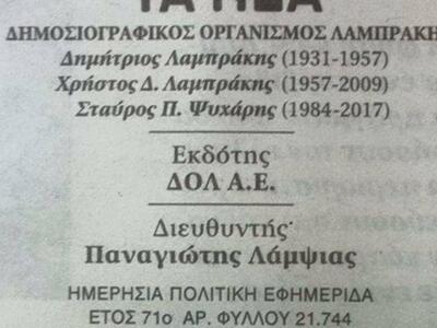 Στην διεύθυνση της εφημερίδας παραμένει ο Παναγιώτης Λάμψιας.