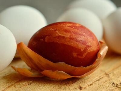 Κεραμιδί αυγά: Τα φύλλα από 5-6 μεγάλα ξερά κρεμμύδια δίνουν ένα ωραίο χρώμα τερακότας.