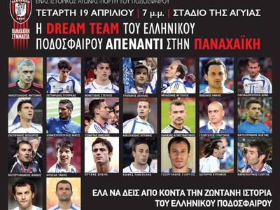 Μετρούν αντίστροφα οι Πατρινοί φίλαθλοι για το μεγάλο φιλικό της Παναχαϊκής με την Dream Team του ελληνικού ποδοσφαίρου, σήμερα στις 7 το απόγευμα στην Αγυιά. Μία μεγάλη γιορτή θα πραγματοποιηθεί στην Πάτρα, στην οποία θα δώσουν το παρών παίκτες που έχουν συνδέσει το όνομά τους με την ιστορία του ελληνικού ποδοσφαίρου.