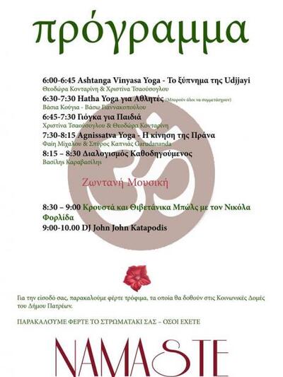 Το 1ο Yoga Spring festival έρχεται στην Πάτρα το ερχόμενο Σάββατο με σκοπούς... φιλανθρωπικούς! Πέντε δάσκαλοι της yoga διοργανώνουν το event στην αίθουσα Αίγλη της veso mare της Ακτής Δυμαίων από τις 6.30 το απόγευμα του επόμενου Σαββάτου και ζητούν από όσους θέλουν να συμμετάσχουν να προσφέρουν τρόφιμα για τις κοινωνικές δομές του Δήμου Πατρέων.