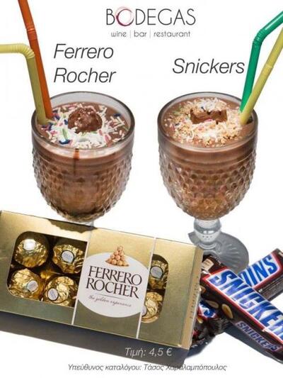 Εξωτικο bounty,σοκολατενια snickers,αρωματικη φραουλα lila pause και μοναδικη γεση ferrero rocher θα κοσμουν τα νεα ροφηματα που ετοιμασε το bodegas για την φετινη ανοιξη -καλοκαιρι γεματα με ολοκληρα κοματια απο την αγαπημενη σας σοκολατα που πραγματικα τα περιμενουν με ανυπομονησια οι θαμωνες του διασημου wine bar της ρηγα φεραιου που θελουν κατι παραπανω απο εναν απλο καφε...