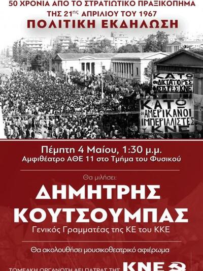 «Η Τομεακή Οργάνωση ΑΕΙ Πάτρας της ΚΝΕ πραγματοποιεί μεγάλη πολιτική εκδήλωση με τίτλο « 50 χρόνια από το στρατιωτικό πραξικόπημα της 21ης Απριλίου του 1967»