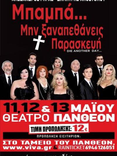 Μετά την φετινή χειμερινή της επιτυχία, η παράσταση «Μπαμπά μην Ξαναπεθάνεις Παρασκευή» και έχοντας μονοπωλήσει για 5 συνεχόμενα χρόνια το θεατρικό ενδιαφέρον της Αθήνας, συνεχίζει ακάθεκτη το ταξίδι της σε όλη την Ελλάδα για να προσφέρει άφθονο καθαρό γέλιο και διασκέδαση.