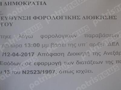 Νέο σφράγισμα σε επιχείρηση στην Ηλεία εξαιτίας φορολογικής παράβασης. Σύμφωνα με πληροφορίες της εφ.«Πατρίς», αυτή τη φορά μπήκε «λουκέτο» για πέντε ημέρες σε κατάστημα υγειονομικού ενδιαφέροντος στην ευρύτερη περιοχή του Πύργου, καθώς διαπιστώθηκε παράβαση μη έκδοσης αποδείξεων ύψους περίπου 300-350 ευρώ.
