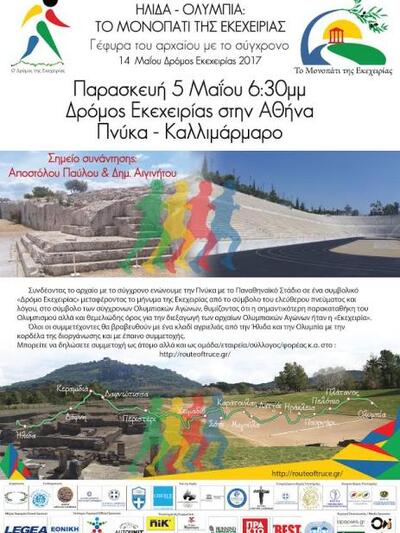Υπό την Αιγίδα της Α.Ε. του Προέδρου της Δημοκρατίας Κυρίου Προκοπίου Παυλοπούλου θα διεξαχθεί στην Ηλεία ο «Δρόμος της Εκεχειρίας 2017». Οι δρομείς θα τρέξουν από την Αρχαία Ήλιδα στην Αρχαία Ολυμπία.