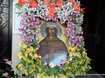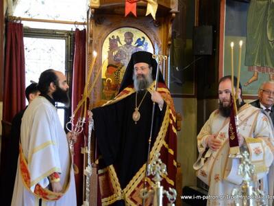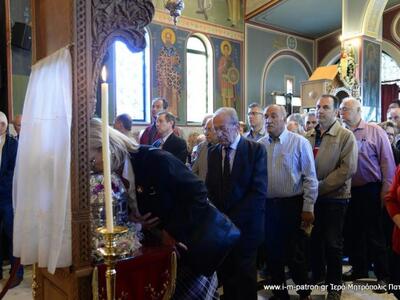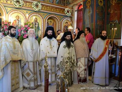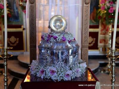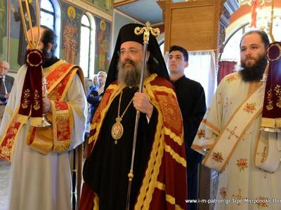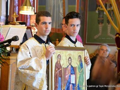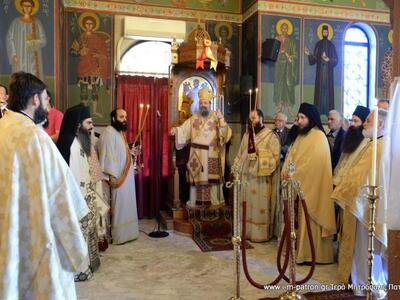 Ἀνήμερα, ἐτελέσθη ἡ Θεία Λειτουργία, ὑπό τοῦ Σεβασμιωτάτου Μητροπολίτου Πατρῶν κ.κ. Χρυσοστόμου, ὁ ὁποῖος ἐκήρυξε τόν θεῖο λόγο, ἀναφερθείς στό ἀντιστασιακό καί ἀνυποχώρητο φρόνημα τῶν Ἁγίων, ἐναντίον τῶν ἀρχῶν καί ἐξουσιῶν τοῦ κόσμου τοῦ αἰῶνος τούτου, προκειμένου νά κερδίσουν τήν αἰώνια Βασιλεία τοῦ Θεοῦ.