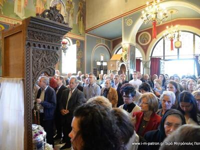 Τήν παραμονή, 4.5.2017, ἐτελέσθη ὁ Μέγας Πανηγυρικός Ἑσπερινός, ἐν πληθούσῃ Ἐκκλησίᾳ, κατά τόν ὁποῖο τόν θεῖο λόγο ἐκήρυξε ἐπικαίρως, ὁ Πανοσιολογιώτατος Ἀρχιμ. π. Ἀρτέμιος Ἀργυρόπουλος, Πρωτοσύγκελλος τῆς Ἱερᾶς Μητροπόλεως Πατρῶν.