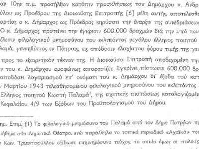 Το αίτημα για μετονομασία της οδού Κορίνθου σε οδό Κωστή Παλαμά, υπογεγραμμένο από περίπου 3.000 άτομα, κατέθεσε χθες στον Δήμο Πατρέων ο Σύλλογος Πατρινών Καλλιτεχνών Εικαστικών Τεχνών. Όπως αναφέρει ο Σύλλογος στην επιστολή που κοινοποίησε στον Δήμαρχο Πατρέων, την Πρόεδρο του Δημοτικού Συμβουλίου και τα μέλη του "το 1943, την ημέρα του θανάτου του ποιητή, εδώ και 71 χρόνια, το τότε Δημοτικό Συμβούλιο στη μνήμη του πήρε μια ιστορική απόφαση, ο δρόμος μπροστά από το σπίτι του Ποιητή, προς Κόρινθο, να ονομαστεί οδός Κ. Παλαμά.