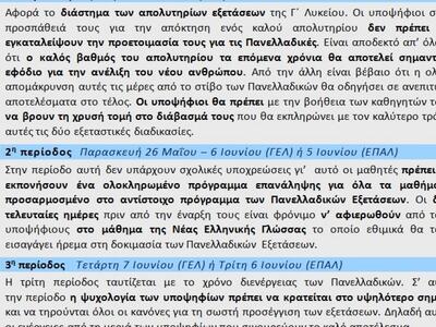 Πάντως θα πρέπει να γνωρίζουν οι υποψήφιοι πως το γεγονός ότι οι Απολυτήριες Εξετάσεις προηγούνται των Πανελλαδικών και ότι οι Επαναληπτικές τους διενεργούνται το Σεπτέμβριο διαφοροποιεί το εξεταστικό μείγμα των φετινών Πανελλαδικών Εξετάσεων αναφορικά με τα αμέσως προηγούμενα χρόνια. Σε καμία περίπτωση όμως μέχρι και το τέλος των Πανελλαδικών δεν πρέπει να γίνεται λόγος από τους υποψηφίους για κίνηση των βάσεων ούτε για εύκολη ή δύσκολη εισαγωγή στην Ελληνική Τριτοβάθμια Εκπαίδευση.