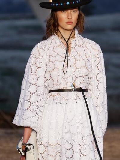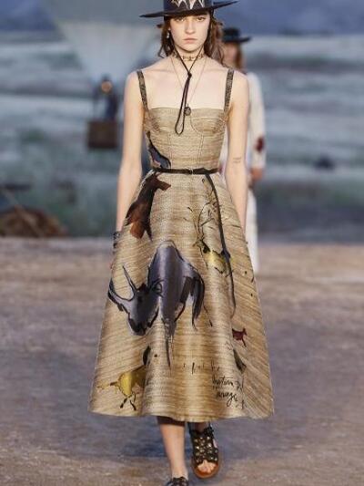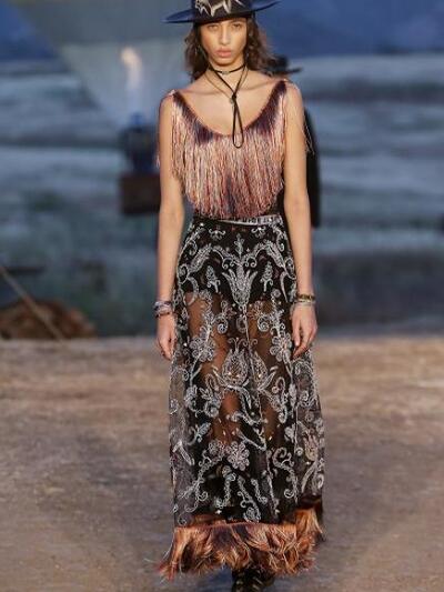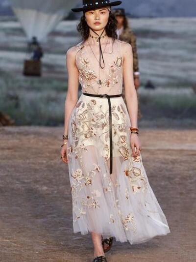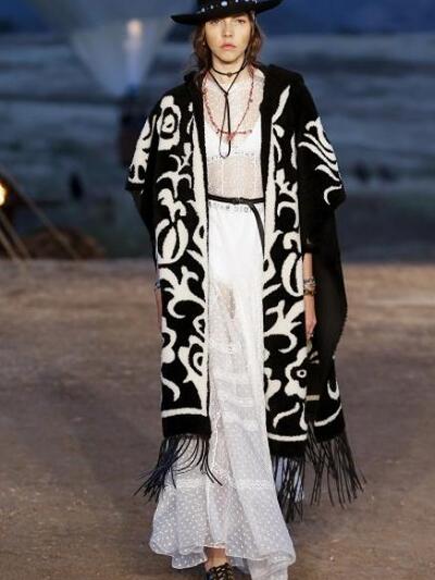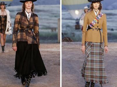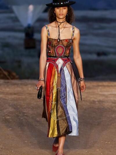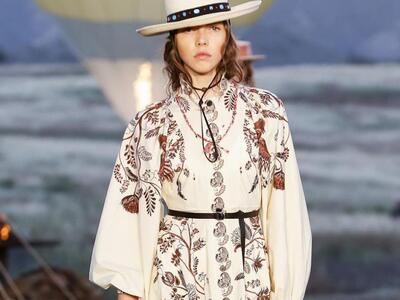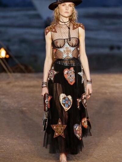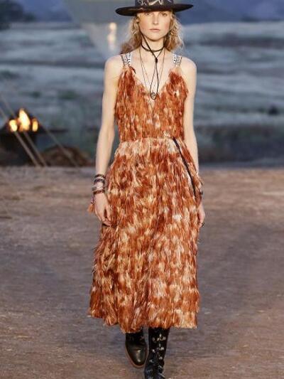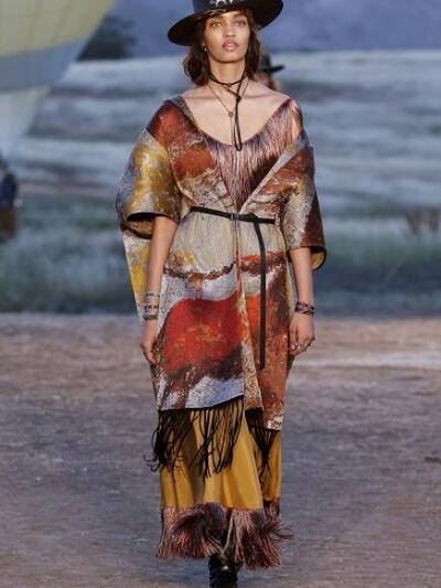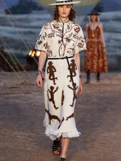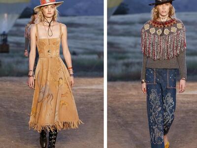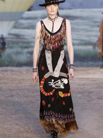 Tυπώματα με σκελετούς, αετούς και φίδια, ινδιάνικα κρόσια και φτερά, πολλά καρώ, καουμπόικα σουέντ, νομαδικά πλεκτά, γούνες σαν τομάρια ζώων, παραδοσιακά λουλούδια, τούλια με πολύχρωμα κεντήματα, διάφορα είδη πόντσο και εμπριμέ σαν τοπία σύγχρονης τέχνης. Φοκλορικά καπέλα «bolero», εφαρμοστά σακάκια, κλος και σουρωτές φούστες αλλά και τα χαρακτηριστικά μπουστάκια με τις logo τιράντες παρέλασαν σε διάφορες εκδοχές. Το πρώτο μέρος της συλλογής βασιζόταν στους γήινους καφέ –μπεζ τόνους αλλά μετά ακολούθησαν δημιουργίες με βάση το μαύρο και το λευκό. Ο οίκος Christian Dior θέλησε να ξεφύγει από το Παρίσι ατενίζοντας με το δικό του τρόπο μια διαφορετική, ξερή, νομαδική γη, σαν τους πίνακες της Τζόρτζια ο Κιφ και με διάθεση εξερευνητή.