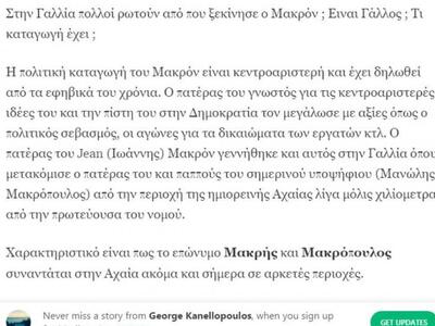 Ένα κείμενο για την καταγωγή του νέου προέδρου της Γαλλίας Εμανουέλ Μακρόν κάνει το γύρο του διαδικτύου κυρίως στα προφιλ των χρηστών των social media από την Πάτρα. Το τοπικό ενδιαφέρον έχει προκαλέσει η αιτιαση για την καταγωγή του. Ο συντάκτης του κειμένου Γιώργος Κανελλόπουλος, υποστηρίζει με το κείμενό του στην πλατφόρμα medium.com οτι ο παππούς του...Μανώλης Μακρόπουλος κατάγεται από ημιορεινή περιοχή πολύ κοντά στο κέντρο της Πάτρας !