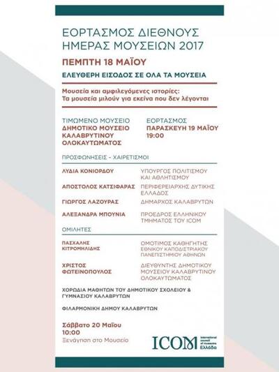 «Την Παρασκευή, 19 Μαΐου στις 7:00 το απόγευμα, στον προαύλιο χώρο του Δημοτικού Μουσείου Καλαβρυτινού Ολοκαυτώματος θα πραγματοποιηθεί εκδήλωση για το Δημοτικό Μουσείο, το οποίο επιλέχθηκε, από το Διεθνές Συμβούλιο Μουσείων (ICOM) – Ελληνικό Τμήμα, ως το τιμώμενο Μουσείο για το έτος 2017, στα πλαίσια εορτασμού της Διεθνούς Ημέρας Μουσείων.