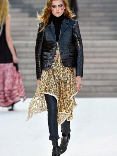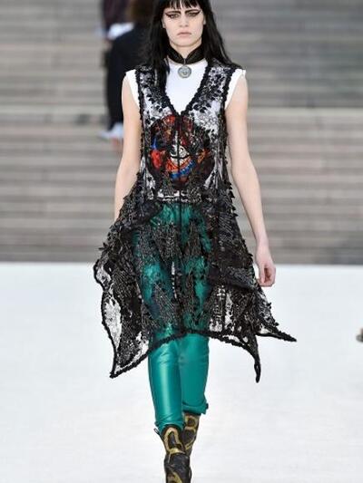 Φορέματα με ασύμμετρα στριφώματα πάνω από κολάν και δερμάτινα παντελόνια, πάτσγουορκ λεοπάρ τζάκετ και παλτά, γιλέκα σαν πανοπλίες, μάξι σαν θεατρικές μεταλιζέ φορεσιές, εμπριμέ σαν γκράφιτι, δερμάτινα σακάκια σε vintage ύφος και μυτερά μποτίνια παρέλασαν στο Μουσείο Miho του Κυότο μέσα στη φύση. Το μακιγιάζ ήταν εκκεντρικό με έντονο αιλάινερ και τα μαλλιά ξέπλεκα. Τα ρούχα φοριούνταν ανατρεπτικά το ένα πάνω στο άλλο. Δείτε στιγμιότυπα.