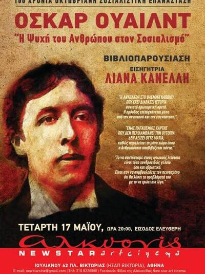 Ένα δοκίμιο του σπουδαίου Ιρλανδού νοβελίστα και θεατρικού συγγραφέα Όσκαρ Ουάιλντ (1854-1900) με τίτλο «Η Ψυχή του Ανθρώπου στον Σοσιαλισμό» θα παρουσιαστεί απόψε Τετάρτη 17/5/2017 μετά τις 20.00 σε εκδήλωση στο Αλκυονίς new star art cinema, στην οδό Ιουλιανού κοντά στην πλατεία Βικτωρίας, στην Αθήνα με εισηγήτρια την δημοσιογράφο και βουλευτή του ΚΚΕ.