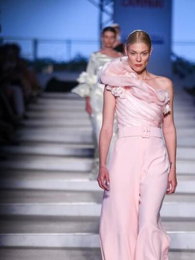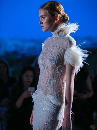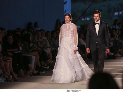 Ροζ, γαλάζια, ασημόλευκα…Παλέτα φινέτσας, αρμονίας και αρχοντιάς, δίχως «σκληρές» αντιθέσεις. Μεταξωτές, αιθέριες δαντέλες και τούλια με περίτεχνα κεντήματα και κρυστάλλους Swarovski που δίνουν την αίσθηση ρούχων-γλυπτών, αέρινες οργάντζες που σχηματίζουν λουλούδια και αγκαλιάζουν το γυναικείο σώμα, μίνι φορέματα με αστραφτερά κρόσσια που ακολουθούν τα λίκνισμα του κορμιού, τουαλέτες με κοφτά παραδοσιακά κεντήματα και φτερά, αλλά και το σήμα κατατεθέν του οίκου, τα νυφικά, συνέθεσαν τις βασικές ενότητες της επίδειξης, που καταχειροκροτήθηκε.