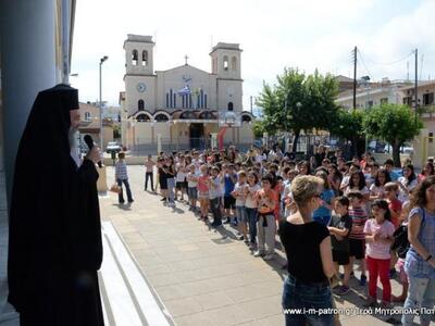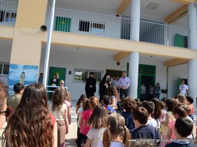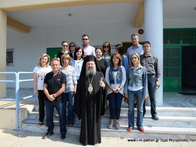 Μετὰ τὸ πέρας τῆς Θείας Λειτουργίας ὁ Σεβασμιώτατος ἐπεσκέφθη τὸ 33ο Δημοτικό Σχολεῖο ὅπου συνομίλησε μὲ τοὺς Δασκάλους ( ὁ Διευθυντής καί κάποιοι Δάσκαλοι, ἦτο σπουδασταί τοῦ Σεβασμιωτάτου, ὃταν ἐδίδασκε στήν Παιδαγωγική Ἀκαδημία Τριπόλεως), μίλησε στούς Μαθητές καὶ τούς εὐχήθηκε τὰ δέοντα.