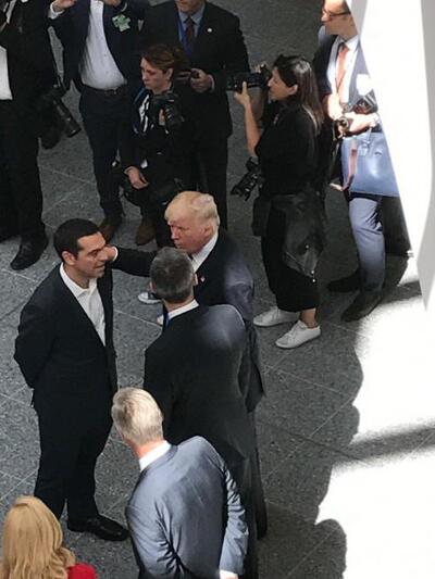 Σύμφωνα με το ΑΠΕ, ο Αμερικανός Πρόεδρος είπε στον Αλέξη Τσίπρα κατά το ολιγόλεπτο τετ-α-τετ που είχαν πριν την έναρξη της Συνόδου του ΝΑΤΟ, «σε παρακολουθώ. Ανακάμπτετε και αυτό είναι εκπληκτικό». Επίσης ο Ντ. Τραμπ, στην συνομιλία του με τον Έλληνα πρωθυπουργό πρόσθεσε ότι: «Η Ελλάδα είναι μια υπέροχη χώρα με υπέροχους ανθρώπους».
