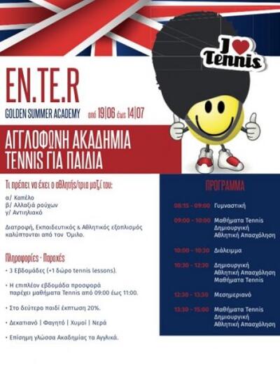 Πρωτοτυπεί το Golden Tennis Club στον Καστελόκαμπο (Αχιλλέως και Φέγκου) ανακοινώνοντας παιδικά καλοκαιρινά μαθήματα τένις τριών εβδομάδων (+ μιας δωρεάν έξτρα εβδομάδας), από 19 Ιουνίου ως 14 Ιουλίου, στην αγγλική γλώσσα, έτσι ώστε τα «βλαστάρια» μας να αθλούνται και να εξασκούνται στα αγγλικά ταυτόχρονα. Η EN.TE.R Golden Summer Academy διαθέτει πρόγραμμα από τις 8.15 το πρωί ως τις 3 το μεσημέρι με το που θα κλείσουν τα σχολεία.