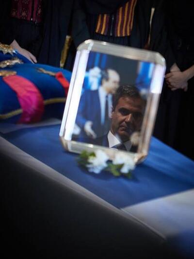 Στη φωτ. από το Αθηναικό Πρακτορείο Αθηνών, φαίνεται η κορνίζα με τη φωτογραφία του επίτιμου Προέδρου της ΝΔ που ήταν τοποθετημένη στο φέρετρο με τη σορό του που κάλυπτε η γαλανόλευκη σημαία, και σε έναν αντικατοπτρισμό... διακρίνεται ο γιος του, Κυριάκος Μητσοτάκης, να είναι βουβός και με ένα βλέμμα «χαμένο», να θρηνεί για την απώλεια του πατέρα του πάνω από το φέρετρο.