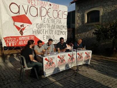 Η πρώτη μέρα ξεκίνησε με την εξαιρετικά ενδιαφέρουσα εκδήλωση με θέμα «Ο πόλεμος στη γειτονιά μας. Για μια αντιπολεμική διεθνιστική απάντηση». Η εκδήλωση άνοιξε με την καταγγελία του ΝΑΡ και της νεολαία Κομμουνιστική Απελευθέρωση σχετικά με την απαγόρευση του καθεστώτος Ερντογάν να ταξιδέψει από την Τουρκία ο σύντροφος Λεβέντ Τουζέλ, μέλος της Κ.Ε. του Κόμματος Εργασίας ΕΜΕΡ, που είχε προσκληθεί στις Αναιρέσεις για να συμμετάσχει στη συζήτηση. Ακολούθησαν οι ομιλίες του Μουσταφά Τας, μέλος του ΕΜΕΡ που ζει στην Ελλάδα, ο οποίος μετέφερε τον αγωνιστικό χαιρετισμό του Λεβέντ Τουζέλ από την Τουρκία και μίλησε για την κατάσταση στη γειτονική χώρα. Στη συνέχεια το λόγο πήρε η Μαρία Μπικάκη εκ μέρους της Π.Ε. του ΝΑΡ. Πολύ ενδιαφέρουσα ήταν η ομιλία του Μουσταφά Κατίμπ, στέλεχος του Παλαιστινιακού νεολαιίστικου κινήματος και του Λαϊκού Μετώπου για την Απελευθέρωση της Παλαιστίνης, ενώ ακολούθησε ο Νίκος Χαραλαμπόπουλος από την Αντιπολεμική Διεθνιστική Κίνηση.