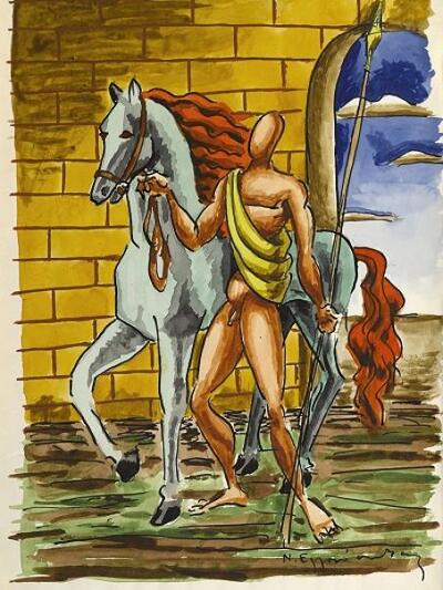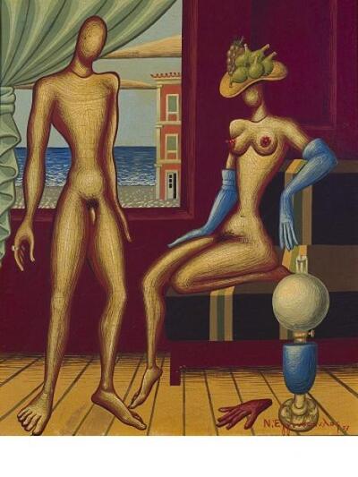 Έλεγε πάντα πως «πρέπει να ζεις όπως σκέφτεσαι γιατί αν ζήσεις με άλλον τρόπο θα καταλήξεις να σκέφτεσαι όπως ζείς». Η ζωγραφική-ψευδαίσθηση του Εγγονόπουλου μας προτείνει μια ελληνική εκδοχή του μεταφυσικού τοπίου του Ντε Κίρικο. Αποθεώνει το σώμα με γυμνασμένες σιλουέτες, εκκεντρικά ρούχα και ερωτικά γυναικεία στήθη σε μέρη υπερφυσικά, που όμως παραπέμπουν στην ελληνική φύση και μνημειακή αρχιτεκτονική.