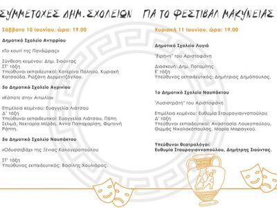 «Ο Δήμος Nαυπακτίας διοργανώνει για πέμπτη συνεχόμενη χρονιά το Μαθητικό Φεστιβάλ Αρχαίου Θεάτρου στη Μακύνεια, στις 10 & 11 Ιουνίου 2017 και ώρα 19:00, συμβάλλοντας στην καθιέρωσή του, ως έναν από τους σημαντικότερους πολιτιστικούς θεσμούς για την ανάδειξη και προβολή του Αρχαίου Θεάτρου Μακύνειας.