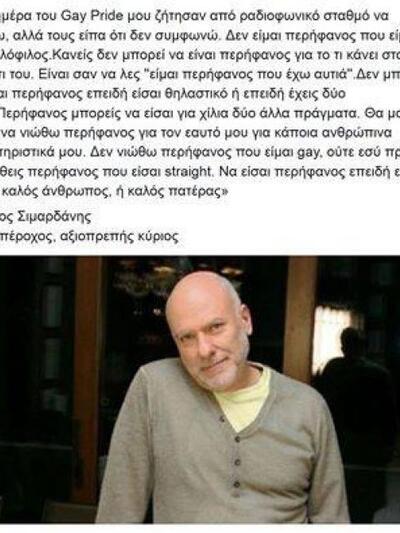 «Την ημέρα του Gay Pride μου ζήτησαν από ραδιοφωνικό σταθμό να μιλήσω, αλλά τους είπα ότι δεν συμφωνώ. Δεν είμαι περήφανος που είμαι ομοφυλόφιλος. Κανείς δεν μπορεί να είναι περήφανος για το τι κάνει στο κρεβάτι του. Είναι σαν να λες“Είμαι περήφανος που έχω αυτιά'”. Δεν μπορείς να είσαι περήφανος επειδή είσαι θηλαστικό ή επειδή έχεις δύο αυτιά. Περήφανος μπορείς να είσαι για χίλια δύο άλλα πράγματα. Θα μου άρεσε να νιώθω περήφανος για τον εαυτό μου για κάποια ανθρώπινα χαρακτηριστικά μου. Δε νιώθω περήφανος που είμαι gay, ούτε εσύ πρέπει να νιώθεις περήφανος που είσαι straight.Να είσαι περήφανος επειδή είσαι τίμιος, καλός άνθρωπος, ή καλός πατέρας», ήταν η δήλωσή του.Επί της αρχής αν ήμασταν 20 άνθρωποι κλεισμένοι σε μια γυάλα, αποκομμένοι από την κοινωνική πραγματικότητα και διαβάζαμε τη δήλωση θα ήταν όντως μια σωστή δήλωση. Κανείς δεν χρειάζεται να είναι υπερήφανος για τον σεξουαλικό του προσανατολισμό και την εξωτερική του εμφάνιση. Αυτό προσπαθεί να πει ο Σιμαρδάνης. Όπως δεν είναι κάποιος περήφανος ως στρέιτ έτσι δεν μπορεί να είναι κάποιος περήφανος ως τρανς, ή ομοφυλόφιλος.