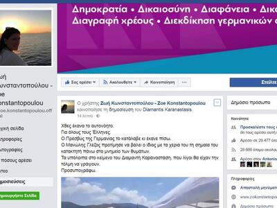 Η τ. πρόεδρος της Βουλής των Ελλήνων Ζωή Κωνσταντοπούλου επανέρχεται στο επεισόδιο που είχε το Σάββατο στο Δίστομο, όταν επιχείρησε να απαγορεύσει στον πρέσβη της Γερμανίας να καταθέσει στεφάνι για τα θύματα της σφαγής από τους Ναζί. Η κύρια Κωνσταντοπούλου με ανάρτησή της στον προσωπικό της λογαριασμό στο facebook, δηλώνει ότι με αυτή της την πράξη έκανε «το αυτονόητο», ενώ σχολιάζει τη στάση του Μανόλη Γλέζου, ο οποίος παρενέβη και πήρε από το χέρι τον Πρέσβη.