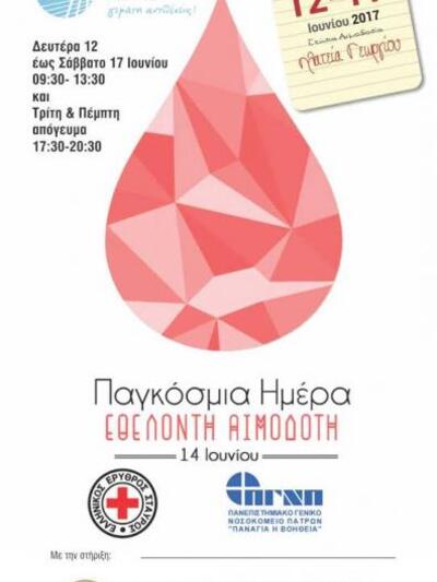 "Συμμετέχει για δεύτερη συνεχόμενη χρονιά στην Εθελοντική Αιμοδοσία της Περιφέρειας Δυτικής Ελλάδας που πραγματοποιείται σήμερα Δευτέρα 12/06/2016 στην Πλατεία Γεωργίου και θα διαρκέσει έως το Σάββατο 17/06/2017.