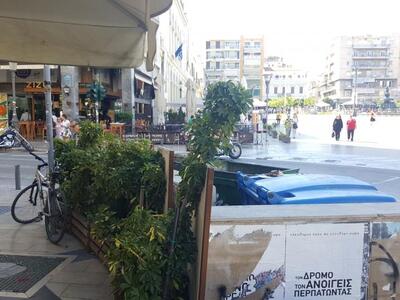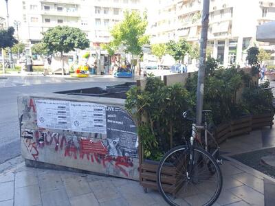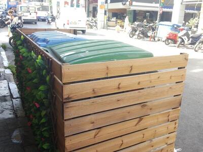 Κάποιοι καταστηματάρχες του κέντρου, στην πλατεία Γεωργίου και στην Ερμού πήραν πρωτοβουλία και χωρίς να αποκόπτουν την πρόσβαση στους κάδους, επένδυσαν τα κίτρινα κιγκλιδώματα που οριοθετούν το χώρο για τους κάδους, με ξύλινες, πρόχειρες κατασκευές - από παλέτες - πάνω στις οποίες έχουν προσαρμοστεί πλαστικά πολύχρωμα λουλούδια. Απλό και καλαίσθητο.