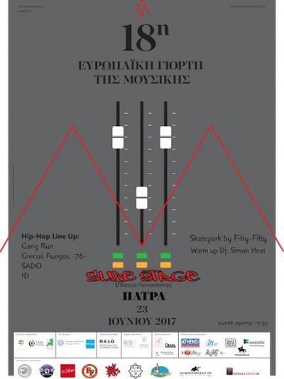 Για 3η συνεχόμενη χρονιά διοργανώνεται στην Πάτρα η Ευρωπαϊκή Γιορτή της Μουσικής. Μια από τις παραδοσιακές σκηνές της γιορτής το hip-hop stage είναι εδώ για ακόμα μια χρονιά πιο δυναμικό με δυνατά ονόματα και πιο διαδραστικό. Φέτος στο χώρο της Πλατεία Παντάνασσας την Παρασκευή 23 Ιουνίου ξεκινάμε νωρίς .Το FIFTY-FIFTY boardshop την μετατρέπει σε skatepark και ανεβάζει την αδερναλίνη σε μια πλατεία κατεξοχήν συνδεμένη με το skate. Στα decks θα είναι ο Simon Heat μέχρι να αρχίσουν τα live.