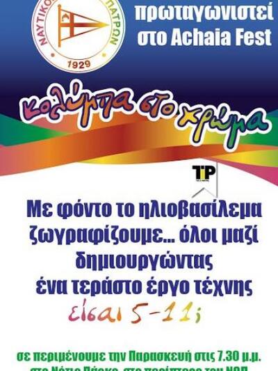 Την Παρασκευή (16/06) στις 19:30 στο περίπτερο του ΝΟΠ στην έκθεση ACHAIA FEST 2017 στο νέο παραλιακό πάρκο (δίπλα στο κολυμβητήριο του ΝΟΠ) τα παιδιά των ακαδημιών υδατοσφαίρισης του ΝΟΠ μαζί με τους προπονητές τους θα συμμετάσχουν σε ένα ιδιαίτερο δρώμενο ζωντανής ζωγραφικής μεγάλων διαστάσεων που θα διευθύνει η καλλιτέχνης Βάσω Καλοκαιρινού, με τίτλο «Κολύμπα στο Χρώμα».