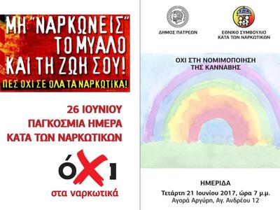 Ο Δήμος Πατρέων, σε συνεργασία με το Εθνικό Συμβούλιο κατά των Ναρκωτικών (ΕΣΥΝ), με αφορμή την Παγκόσμια Ημέρα κατά των Ναρκωτικών, οργανώνουν ημερίδα με θέμα τη νομιμοποίηση της κάνναβης, την Τετάρτη, 21 Ιουνίου 2017, στις 7 μ.μ. στην Αγορά Αργύρη.