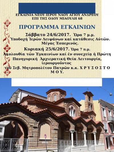 Τελούνται τα θυρανοίξια του Ιερού Ναού του Αγίου Ανδρέα επί της Μιαούλη, που ολοκληρώθηκε μετά από χρόνια, το Σάββατο 24 Ιουνίου. Την πρώτη ακολουθία θα τελέσει ο Σεβασμιώτατος Μητροπολίτης Πατρών κ.κ. Χρυσόστομος την Κυριακή 25 Ιουνίου.