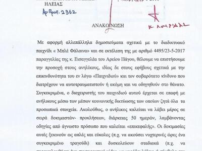 Παρέμβαση και του Εισαγγελέα Πρωτοδικών Ηλείας για το επικίνδυνο διαδικτυακό παιχνίδι "Μπλε Φάλαινα" το οποίο οδηγεί τους εφήβους μέχρι και στην αυτοκτονία. Έχουν προηγηθεί οι εισαγγελικές παρεμβάσεις των εισαγγελέων Αιγίου, Πάτρας και Αμαλιάδας.