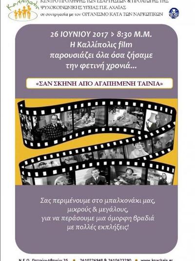 Την Δευτέρα 26 Ιουνίου 2017 στις 20:30 το Κέντρο Πρόληψης Εξαρτήσεων & Προαγωγής Ψυχοκοινωνικής Υγείας ΠΕ Αχαΐας Καλλίπολις πραγματοποιεί εκδήλωση με θέμα: «Σαν σκηνή από αγαπημένη ταινία». Στο πλαίσιο της εκδήλωσης θα προβληθούν αποσπάσματα από αγαπημένες ταινίες του παλιού Ελληνικού Κινηματογράφου, τα θέματα των οποίων θα σχετίζονται με τις ανθρώπινες σχέσεις, την ελληνική οικογένεια και το εκπαιδευτικό σύστημα.
