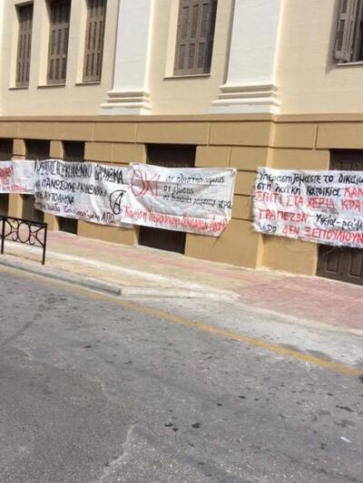 Στο σημείο είχαν αναρτηθεί και πανό διαμαρτυρίας όπως από την Κίνηση Υπεράσπισης Κοινωνικών αγαθών που έγραφαν «όχι σε διακοπές ρεύματος, νερού, όχι σε πλειστηριασμούς».