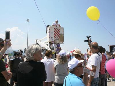 Από το καλάθι ανυψωτικού μηχανήματος μίλησε ο δήμαρχος Πατρέων Κώστας Πελετίδης, προς τους συγκεντρωμένους στο τέλος της πορείας που διοργανώθηκε την Κυριακή από τον Δήμο, κατά της ανεργίας.