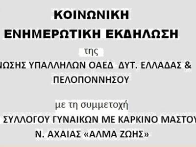 O Σύλλογος Γυναικών με Καρκίνο Μαστού «Άλμα Ζωής», σε συνεργασία με την Ένωση Υπαλλήλων ΟΑΕΔ Δυτικής Ελλάδος και Πελοποννήσου, διοργανώνουν ενημερωτική εκδήλωση για τον καρκίνο του μαστού. Η εκδήλωση θα πραγματοποιηθεί στην αίθουσα εκδηλώσεων του ΤΕΕ Δυτικής Ελλάδας , στις 5/7/17, ημέρα Τετάρτη και ώρα19:00 .