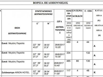 Στη Βο΄ρεια Πελοπόννησο πραγματοποιήθηκαν μικροβιολογικές αναλύσεις σε 36 σημεία. Από αυτά τα 23 κρίθηκαν ακατάλληλα για κολύμβηση ή ανθρώπινη κατανάλωση και τα 13 κατάλληλα.