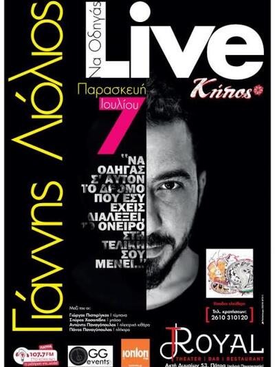 O Πατρινός μουσικός και τραγουδιστής Γιάννης Λιόλιος επιστρέφει αυτή την Παρασκευή 7 Ιουλίου 2017 το βράδυ, μετά τις 21.30 σε έναν από τους αγαπημένους του χώρους στην Πάτρα, τη μουσική σκηνή του Κήπου του Royal Theater, παλιό Πτωχοκομείο στην Ακτή Δυμαίων 53.