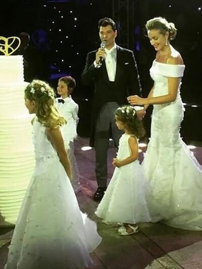 Φορώντας ένα γαμπριάτικο κουστούμι που επιμελήθηκε ο Γιώργος Παπαδόγαμβρος, ο κορυφαίος Έλληνας σταρ περίμενε την γυναίκα της ζωής του έχοντας τα τρία τους παιδιά στο πλευρό του και τον μικρότερο, τονΑπόλλωνα, στην αγκαλιά.
