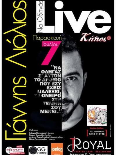 O Γιάννης Λιόλιος την Παρασκευή 7 Ιουλίου επιστρέφει σε έναν από τους αγαπημένους του χώρους στην Πάτρα, τη μουσική σκηνή του Κήπου Royal, στην Ακτή Δυμαίων. Με καλοκαιρινή ροκ διάθεση, τόσο προσωπικά όσο και μουσικά, ανυπομονεί να βρεθεί άλλη μια φορά με φίλους, γνωστούς και μη, για να μας ξανατραγουδήσει "Να Οδηγάς" και όχι μόνο!!