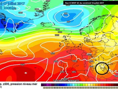 Αιτία γι'αυτή την πρόσκαιρη ανάσα δροσιάς ψυχρή λίμνη (δυναμικό αίτιο) η οποία θα επισκεφθεί την χώρα μας από τα βόρεια-βορειοδυτικά, κομίζοντας, ταυτόχρονα, δροσερότερες αέριες μάζες και καθιστώντας την τροπόσφαιρα άνωθέν μας εξαιρετικά ασταθή.Στον αντίποδα αντικυκλωνικό πεδίο (πεδίο υψηλών βαρομετρικών πιέσεων) παρουσιάζει και πάλι τάσεις επέκτασης στο δυτικό τμήμα της Ευρώπης, ανεβάζοντας εκ νέου τον υδράργυρο σε υψηλά επίπεδα στην Ιβηρική χερσόνησο και σε νοτιότερα τμήματα της Γαλλίας.