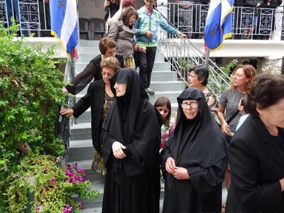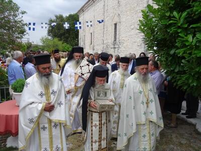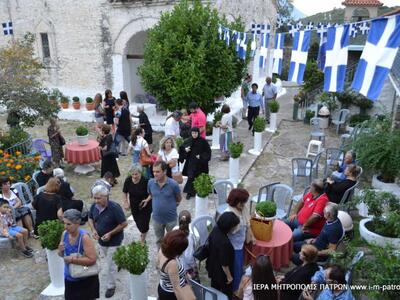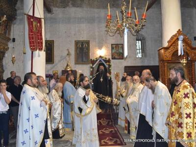 "Τήν παραμονή, 16.7.2017, ἐτελέσθη ὁ μέγας πανηγυρικός Ἑσπερινός, χοροστατοῦντος τοῦ Σεβασμιωτάτου Μητροπολίτου Πατρῶν κ.κ. Χρυσοστόμου, ἐνῶ πλῆθος προσκυνητῶν κατέκλυσε τήν Ἱερά Μονή.