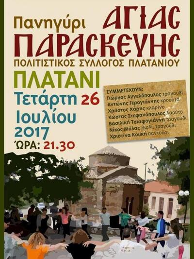 Μένοντας πιστοί στο ραντεβού όπως κάθε χρόνο, ο πολιτιστικός σύλλογος Πλατανίου θα πραγματοποιήσει το πανηγύρι της Αγίας Παρασκευής στο Πλατάνι Πατρών, την Τετάρτη 26 Ιουλίου, στις 9.30 το βράδυ.