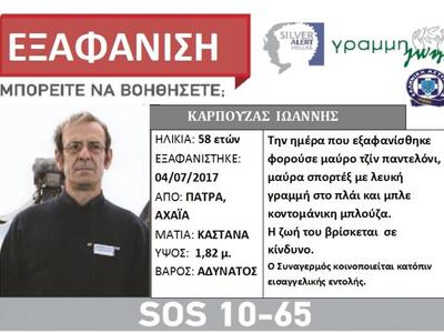 Από τις 4 Ιουλίου έχει να δώσει σημεία ζωής ο 58χρονος Ιωάννης Καρμπουζάς, ο οποίος εξαφανίστηκε από την Πάτρα. Για τον εντοπισμό του δόθηκε Silver Alert μετά από εισαγγελική εντολή, καθώς η ζωή του βρίσκεται σε κίνδυνο.