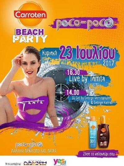 Στο άπλετο και πολυσύχναστο beach bar poco poco στην παραλία Παναγοπούλας, ο ιδιαίτερα αγαπητός συμπολίτης event planner και party expert Χάρης Παναγόπουλος θα υποδεχθεί την …αφόρητα stylish τραγουδίστρια Τάμτα αυτή την Κυριακή 23 Ιουλίου από τις 4.30 το απόγευμα και μετά. Με μεγάλο χορηγό το δημοφιλές αντηλιακό Carroten, προμηνύεται ένα εκρηκτικό live με φόντο τον Πατραικό, καθώς η γεωργιανή ερμηνεύτρια και tv star είναι στο ζενίθ της δημοτικότητάς της. Λέτε να τη δούμε με πολύ crazy beachwear;