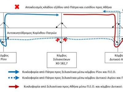 Από τη Δευτέρα 24/07/2017 έως την Παρασκευή 28/07/2017, θα αποκλειστούν οι κλάδοι εξόδου της κατεύθυνσης από Πάτρα και εισόδου στην κατεύθυνση προς Αθήνα του Κόμβου Σελιανιτίκων (ΧΘ 182,7) του αυτοκινητοδρόμου της Κορίνθου-Πατρών και η κυκλοφορία θα εξυπηρετείται από τους όμορους κόμβους Ρίου και Δυτικού Αιγίου και της Παλαιάς Εθνικής Οδού, όπως φαίνεται στο ακόλουθο σχηματικό διάγραμμα.