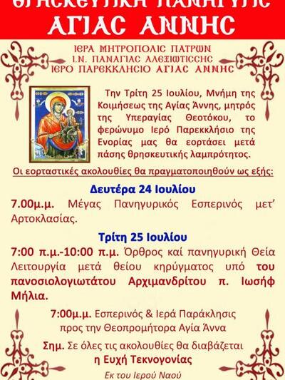 Την κοίμηση της Αγίας Άννης, μητέρας της Υπεραγίας Θεοτόκου τιμά η εκκλησία μας στις 25 Ιουλίου. Στην Πάτρα γιορτάζει το ιερό παρεκκλήσιο της Αγίας Άννης στο κοιμητήριο της Παναγίας Αλεξιώτισσας.